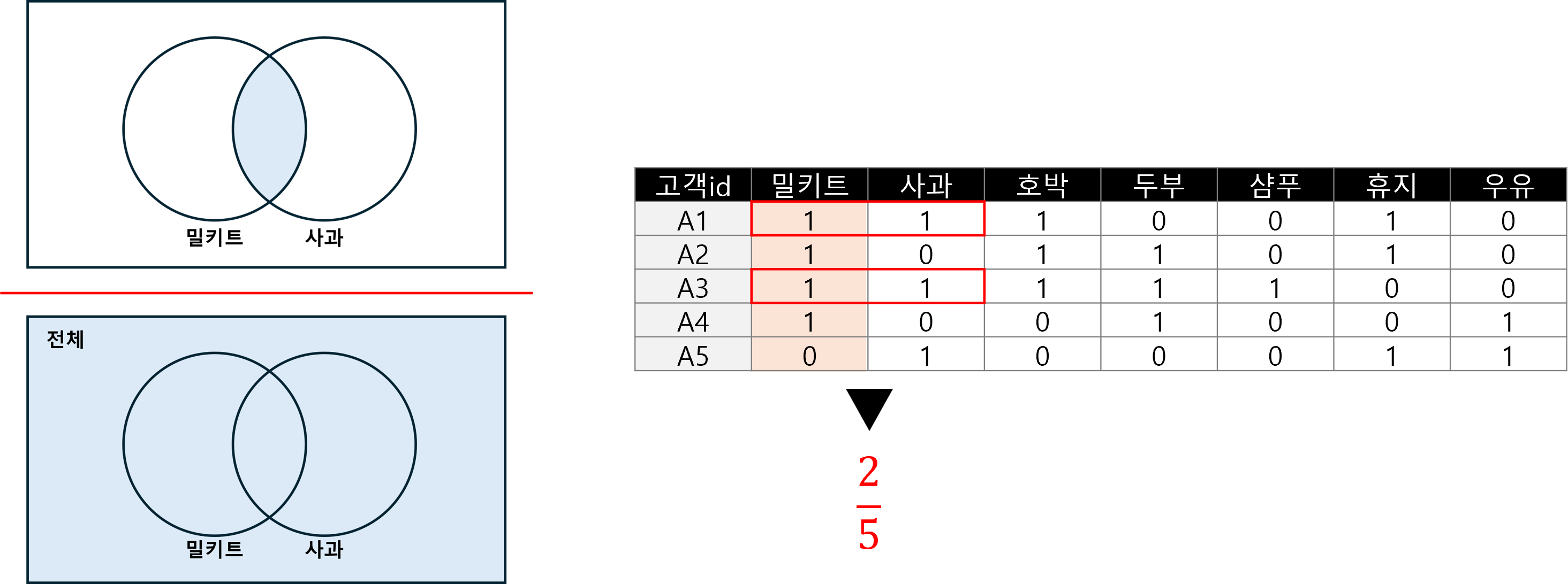 밀키트+사과 구매에 대한 지지도를 파악한다는 가정으로 설명하겠습니다.