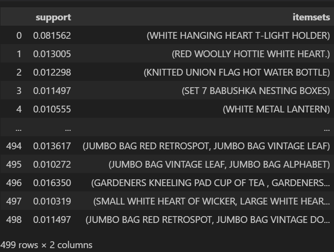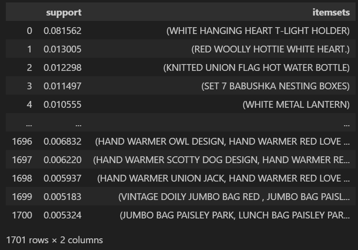 위 코드에서 min_support 는 최소 지지도이고, max_len 은 최대 상품 조합 수, use_colnames = True 는 items 이름을 번호가 아닌 이름으로 표시하도록 합니다.
