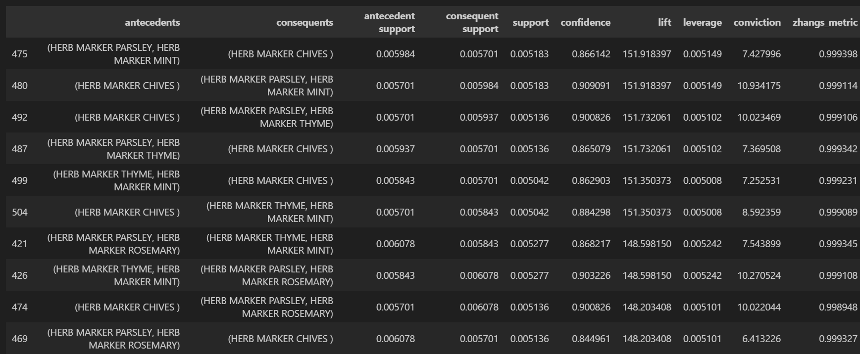 결과가 나온 이후에 결론을 내는 것은 해석하는 담당자의 역량인데요. 저는 개인적으로 support > confidence > lift / leverage 이 순서로 확인합니다.