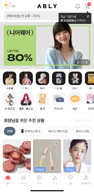 쿠팡은 웹이든 앱이든 미로그인 상태에서 장바구니에 상품을 담으면 재방문 시 메인에 연관 상품이 추천되는데 그와 달리 에이블리는 웹에서만 연관 상품이 메인에 떴다.