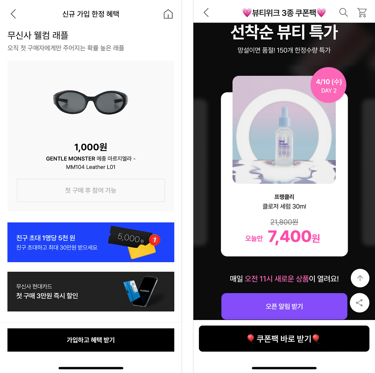 둘 다 앱에서 로그인하지 않은 상태에서는 "첫구매 혜택" 인앱메세지만 노출되었다.(어제까지도 할인도 받고 구매도 했는데...!) 앱에서 로그인 이력이 있는 경우 자동 로그인되기에 로그인하지 않은 고객은 비회원일 가능성이 높다고 보는 것 같았다.(쿠팡, 무신사 둘 다 로그인 페이지에 "자동 로그인" 선택 옵션이 없기에 가능한 일이라 본다.) 웹에서는 별다른 인웹메세지가 노출되진 않았다.