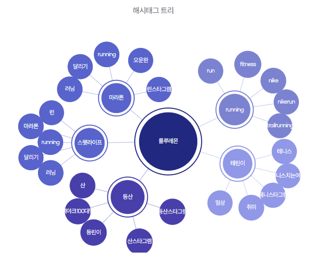 룰루레몬은 등산, 마라톤, 테니스 등 여러 운동 해시태그들이 연관된 반면 젝시믹스는 헬스, 오운완 해시태그가 연관되어 있습니다. 룰루레몬은 일상적인 운동에, 젝시믹스는 보여주는 것에 좀 더 초점이 맞춰져 있다 판단해 볼 수도 있습니다. (실제 젝시믹스 고객 구매이력을 보면 다양한 색상을 선호하거나 리뷰에도 기능성보다 색상, 핏 관련 키워드가 많을 수 있습니다. 리뷰 크롤링을 통해 비교해 볼 수 있습니다.)