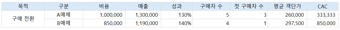 위 표만 보면 B매체의 성과가 좋아 보인다. 그러나 다른 지표를 추가해 보면 어떨까.