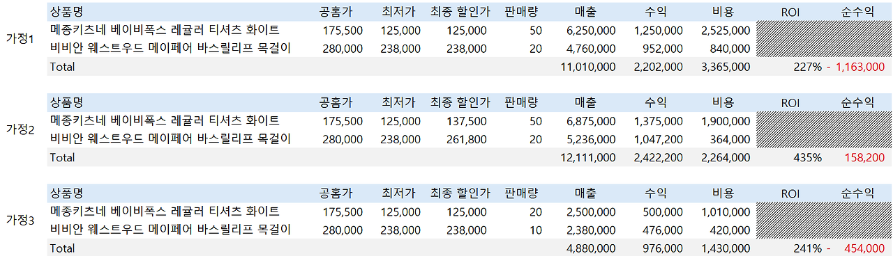 순수익(수익-비용), ROI에서 확연한 차이를 보이는 것을 볼 수 있다. 최저가로 판매하면 수량이 제한적일 수밖에 없기에 가정 1에서 수량만 조절하여 가정 3을 추가해 보았다. 가정2와 가정3을 비교했을 때 가정2 매출이 압도적으로 높고 ROI, 순수익에서도 모두 좋은 결과를 보이는 것을 알 수 있다.