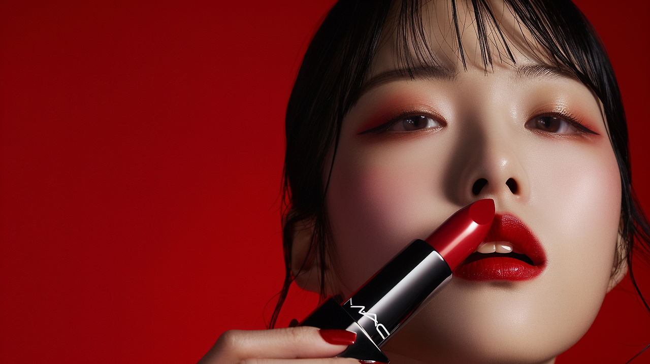 advertisement for cosmetic brand MAC lipstick , MAC logo should stand out , korean model is applying lipstick, red and black background --ar 16:9