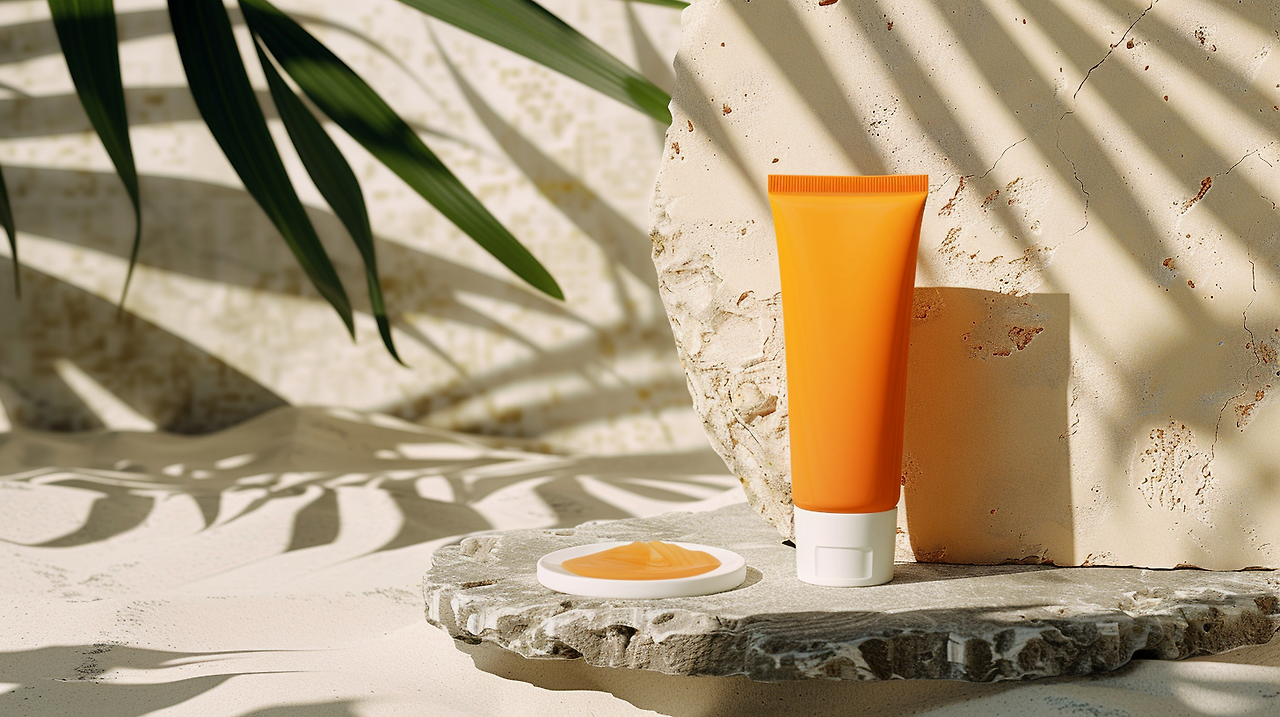sunblock cosmetic packaging on the stone plate on the right side, hot summer vibe , cosmetic packaging zoomed in --ar 16:9