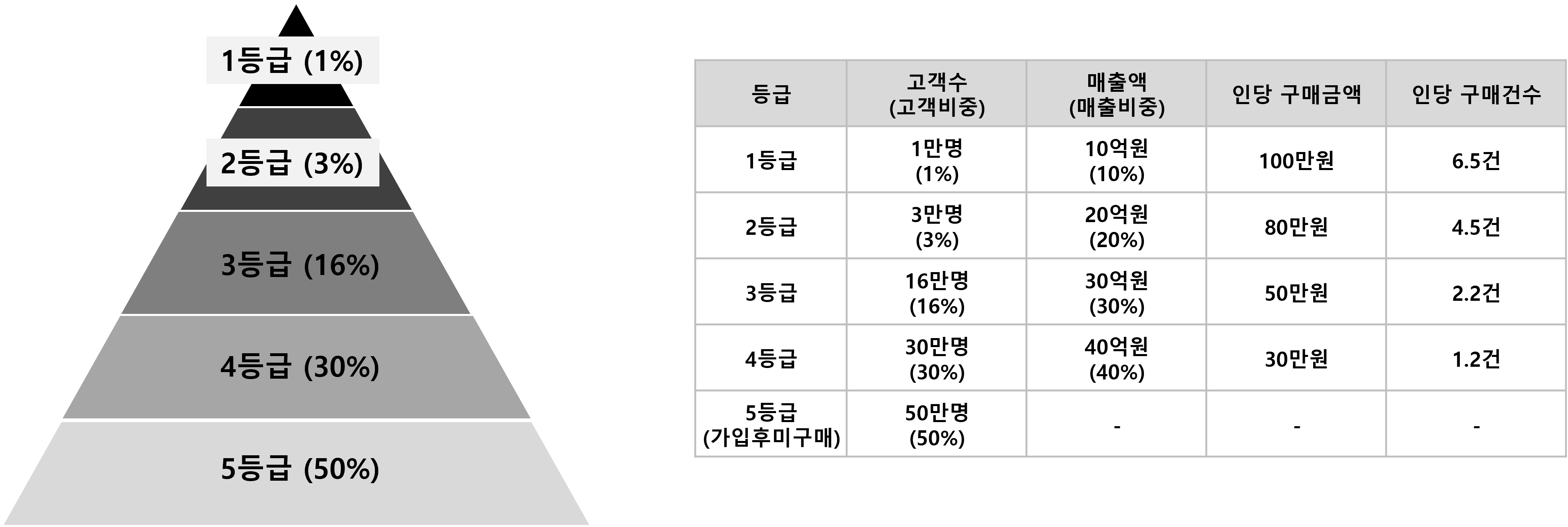 만약 1등급, 2등급의 고객 비중이 전체의 1%, 3%로 등급을 분류하였는데 기존 회원에 적용하였을 때 2등급 비중이 6%로 급격히 늘어난다면 2등급 기준을 상향하는 것이 필요합니다.