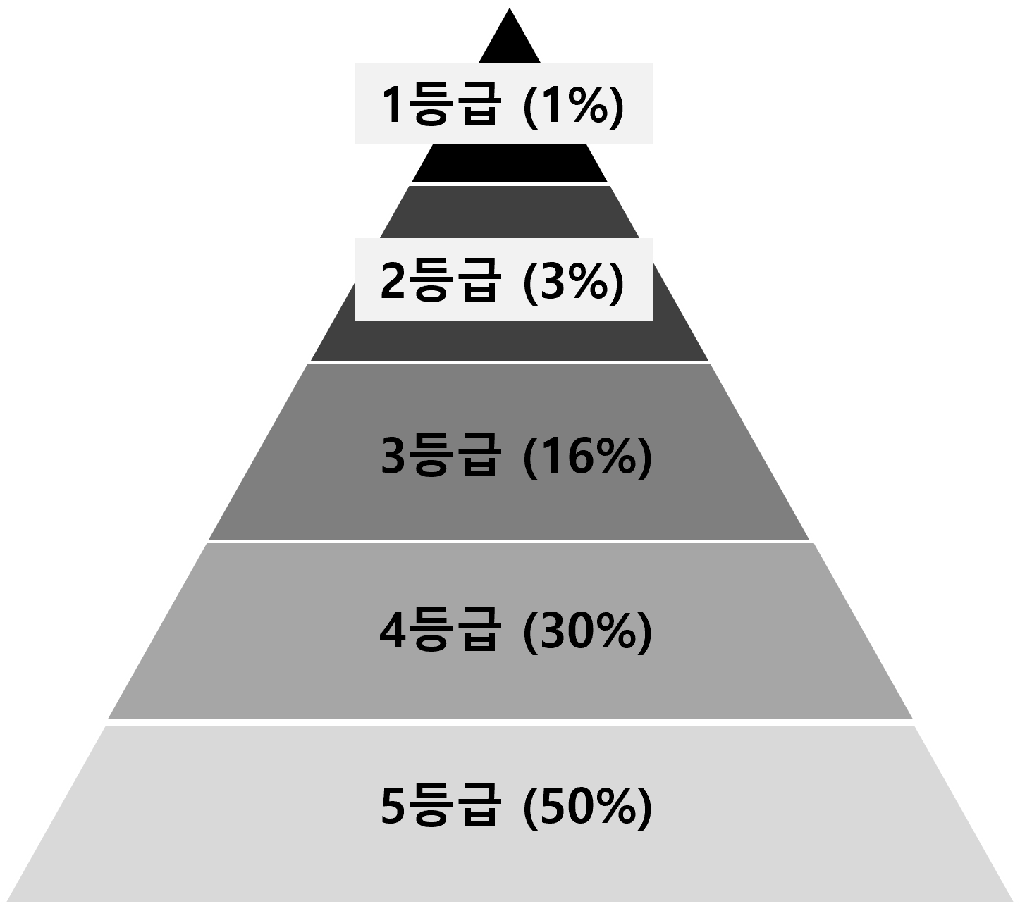 | 5등급 | 0.1% | 0.5% | 2.4% | 19.3% | 77.7% | |