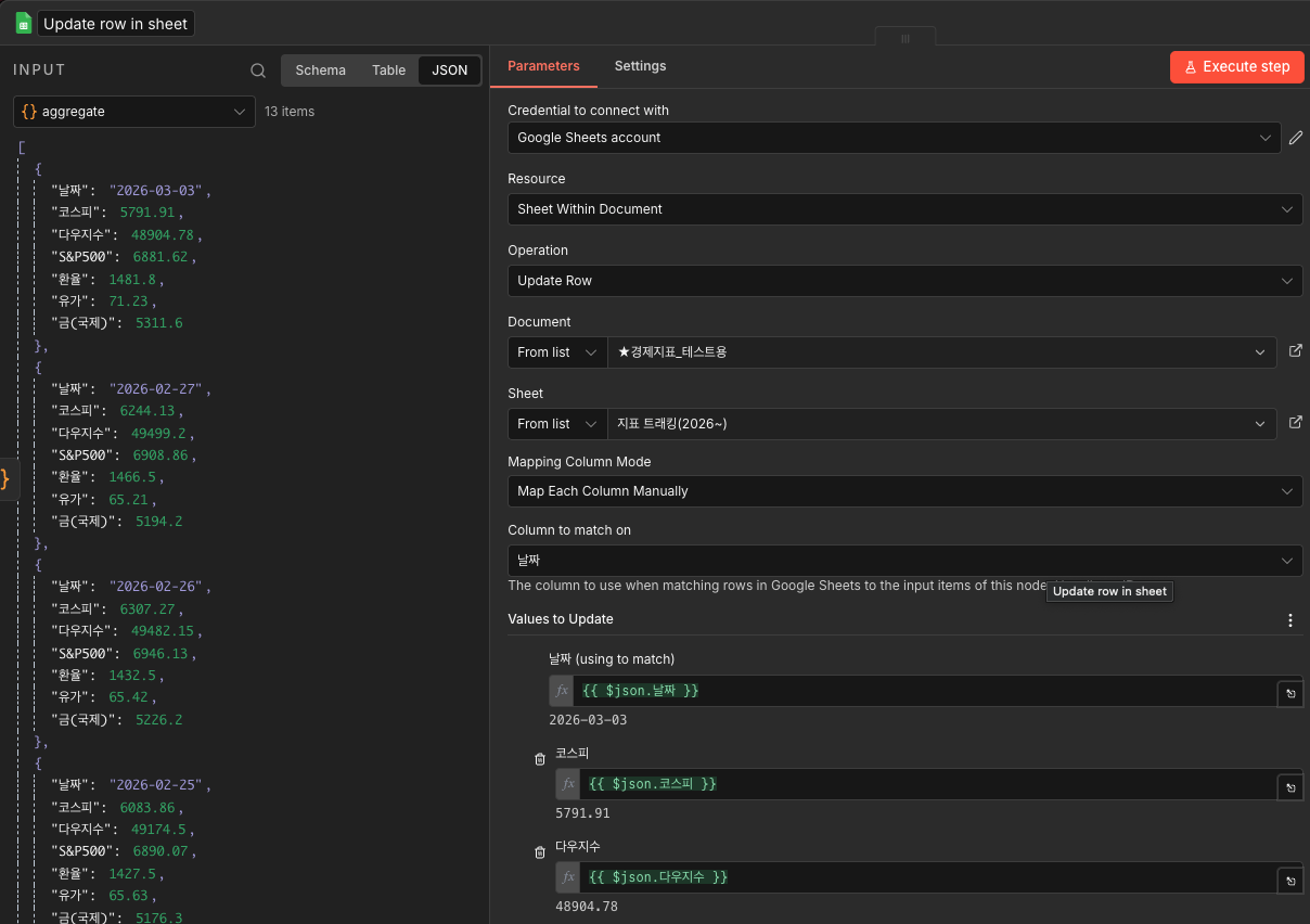 | 5 | [AI자동화] 네이버 증권 "국내/해외 지표" 구글 스프레드시트 자동 업데이트(코스피, S&P500등) >>알수있는 것: N8N html extract 활용+"최근 7일"+여러 지표 업데이트 "현재 글" |