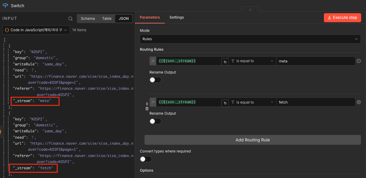 +를 클릭해 switch 를 추가한다. INPUT 데이터를 보면 meta, fetch 가 붙여져 2개 url이 생성된 것을 볼 수 있다. 이걸 나누는 것이라 보면 된다. (meta, fetch 이름은 다른 걸로 써도 된다.)