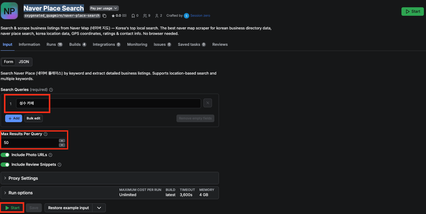 아래와 같이 업체 링크를 넣고 최대로 받을 리뷰 수를 넣고 start를 넣으면 업체명, 리뷰 내용 등을 받을 수 있다.