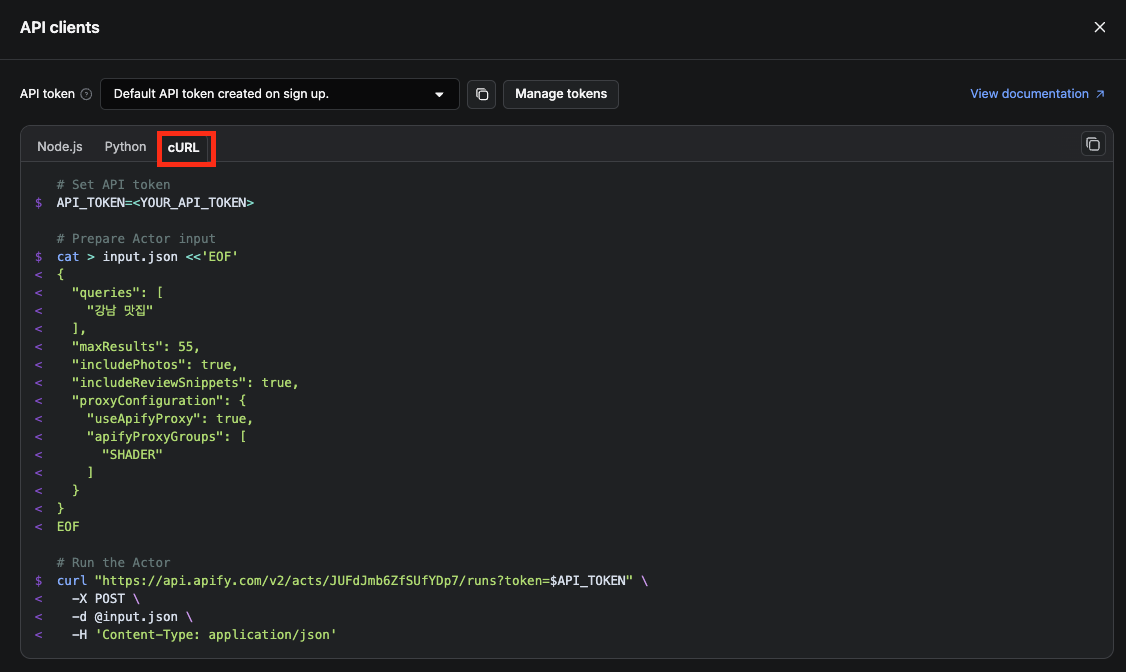 n8n http request 로 apify의 Naver Place Search API를 연동하는 작업이다. 링크로 들어가(가입 필요) 오른쪽 상단 API► API clients► cURL 을 확인하면 된다. 그대로 복붙 하는 형태가 아니므로 n8n 파일 내용을 참고해 개인 API 토큰을 추가하면 된다.