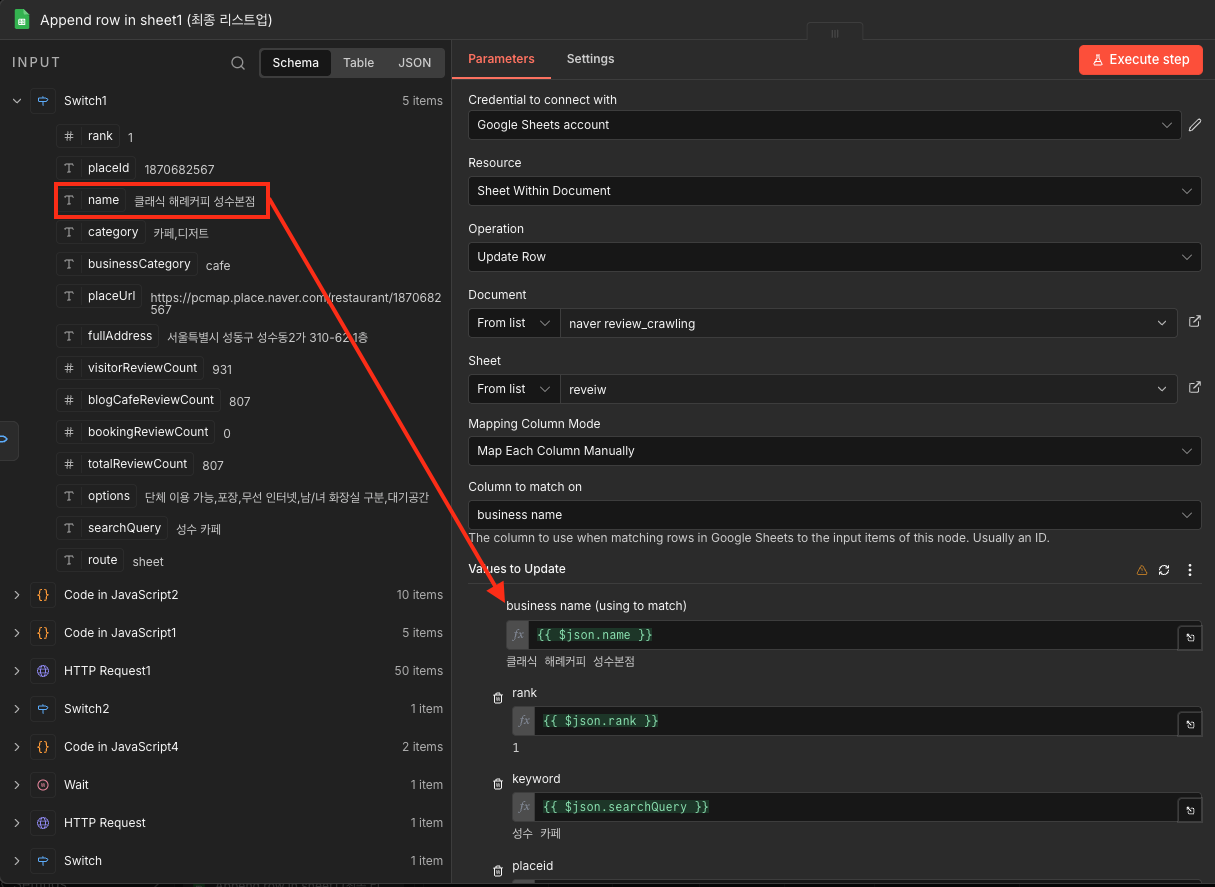 2단계에서 받은 5개 업체 내용을 리뷰 결과 시트에 함께 업데이트하고 싶다면 이 노드를 추가하면 된다. 순서상 loop over items 노드 앞에 있지만 제일 마지막에 실행된다. 그래서 작성 순서도 마지막으로 두었다.