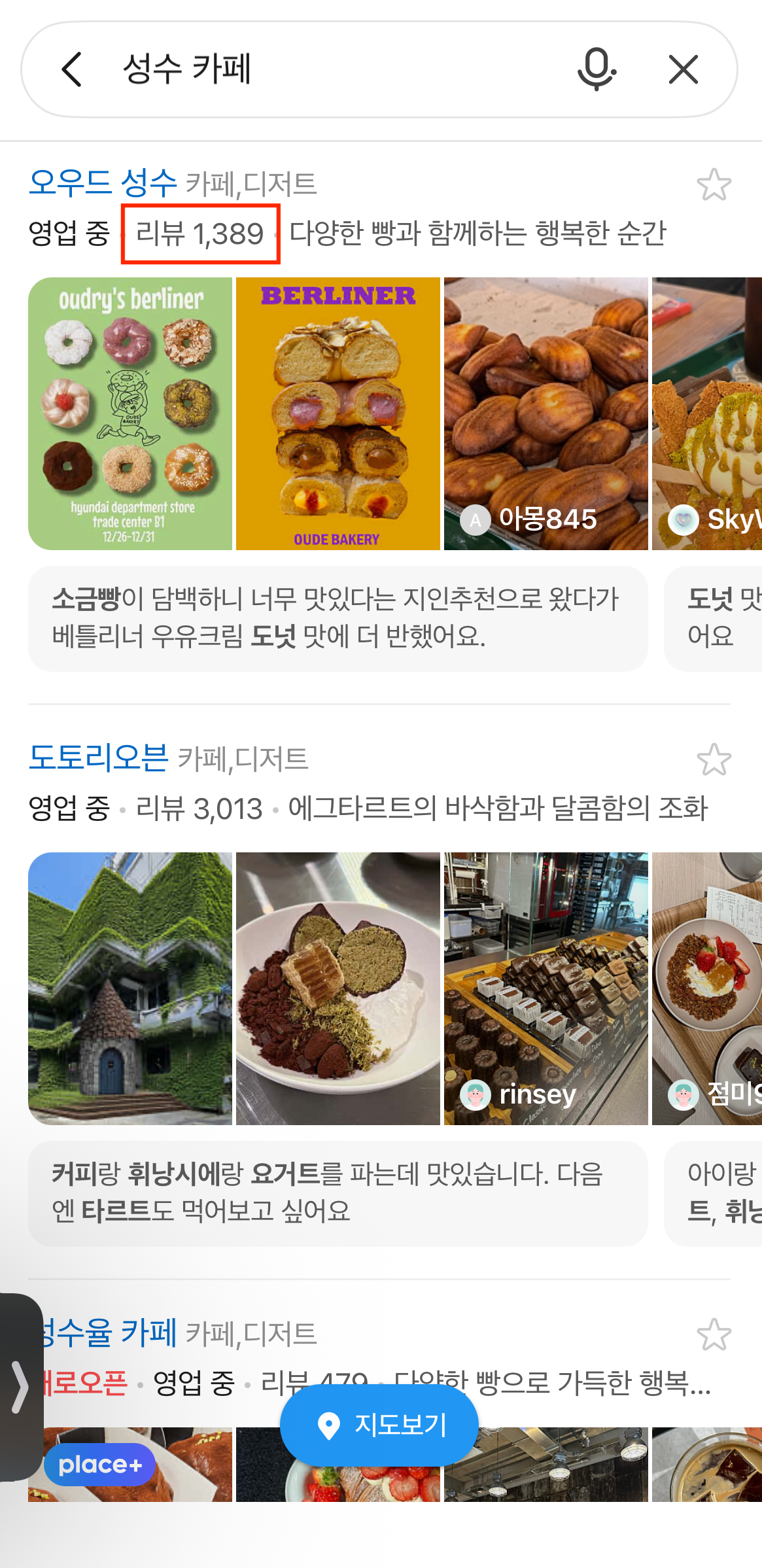 예를 들어 네이버 지도에 "성수 카페"를 검색하면 업체와 리뷰 수, 리뷰들이 쭉 나오는데 이걸 추출해서 AI에게 분석을 시키는 내용이다.