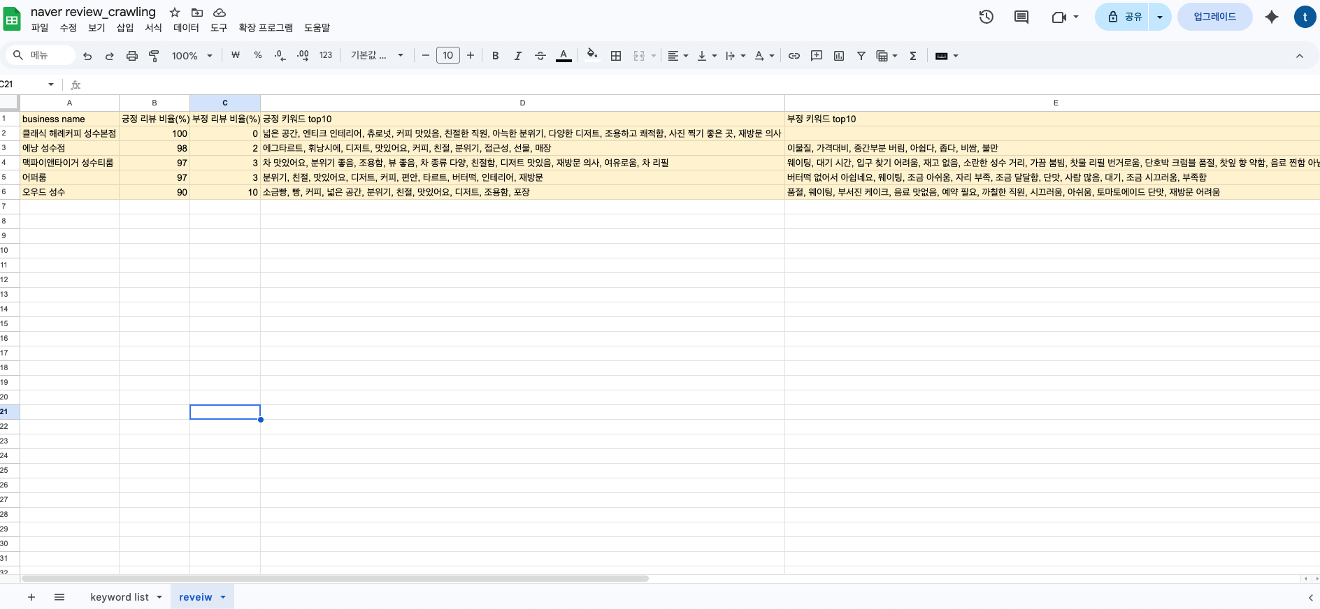 👏👏👏구글 스프레드시트에 업체별 리뷰 분석 데이터 내용이 그대로 들어온다.