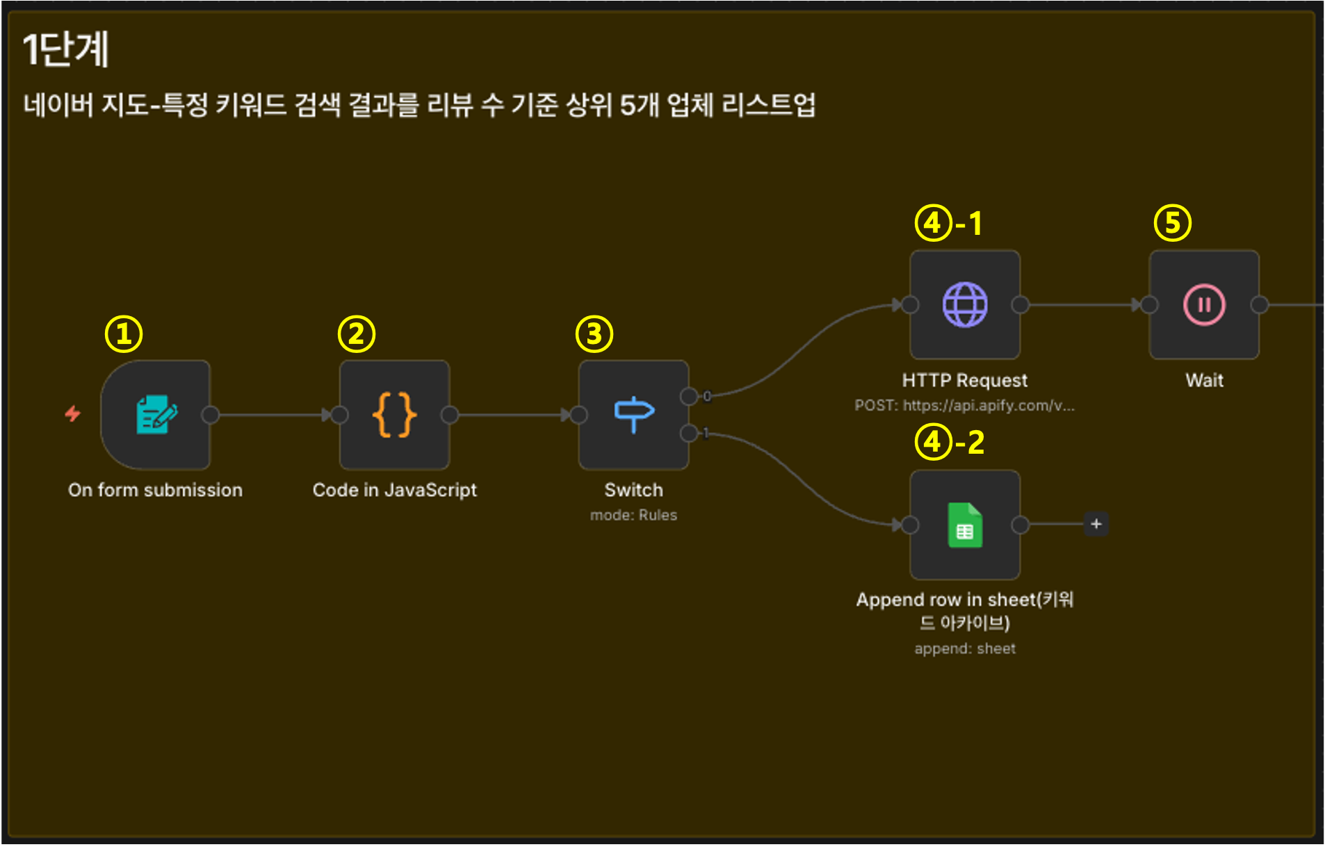 apify의 [Naver Place Search] 를 n8n에 api로 연동하고 검색 결과를 리뷰 수 기준 상위 5개로 추려서 구글 스프레드시트에 1차 업데이트한다.
