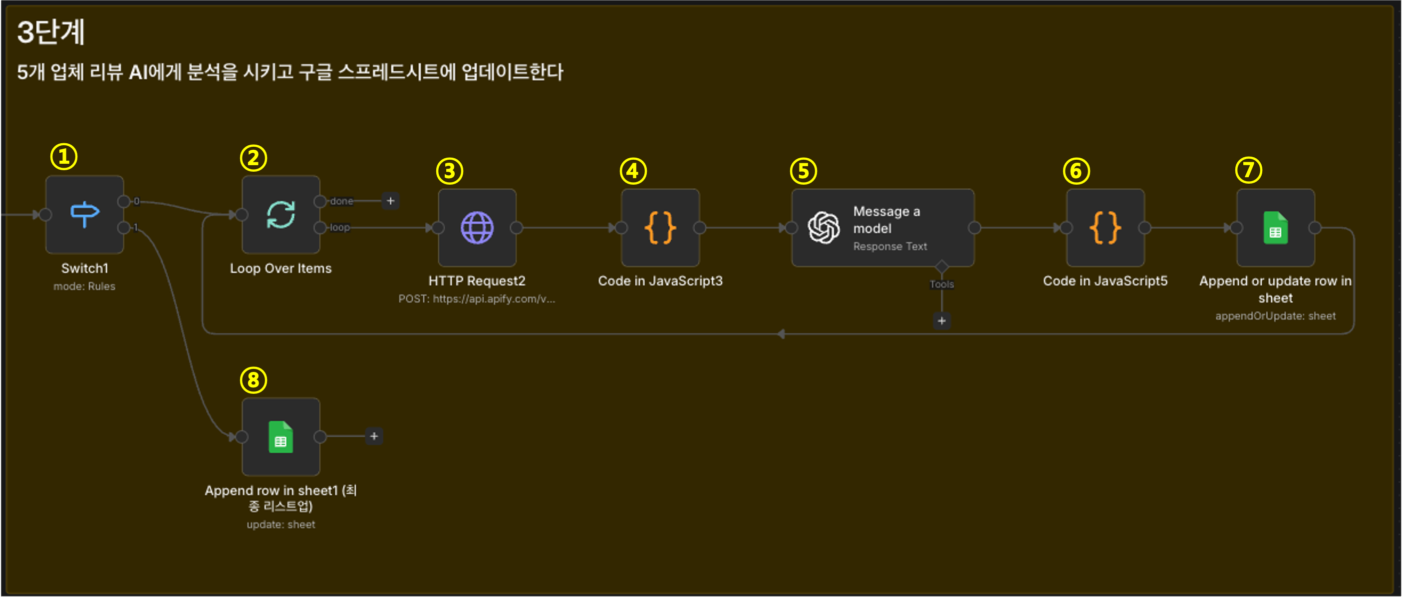 이번 글에서는 [리뷰 내용 크롤링► AI 리뷰 분석► 구글 스프레드시트 업데이트] N8N 워크플로우에 대해 이야기하려 한다.