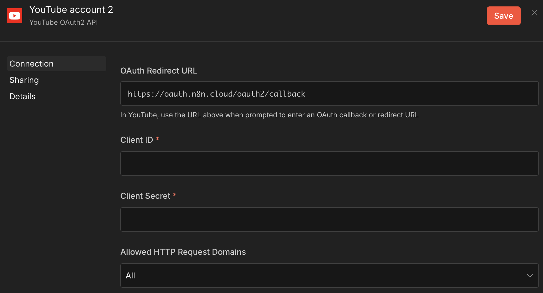 n8n 유튜브 노드를 사용하려면 아래와 같이 계정을 무조건 연결해야 한다.